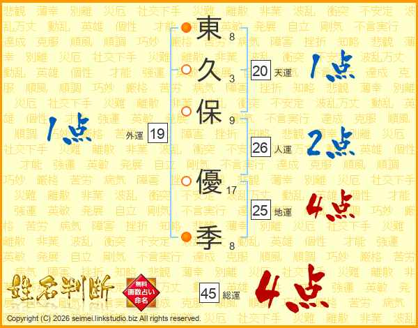 東(8画)久(3画)保(9画) 優(17画)季(8画)