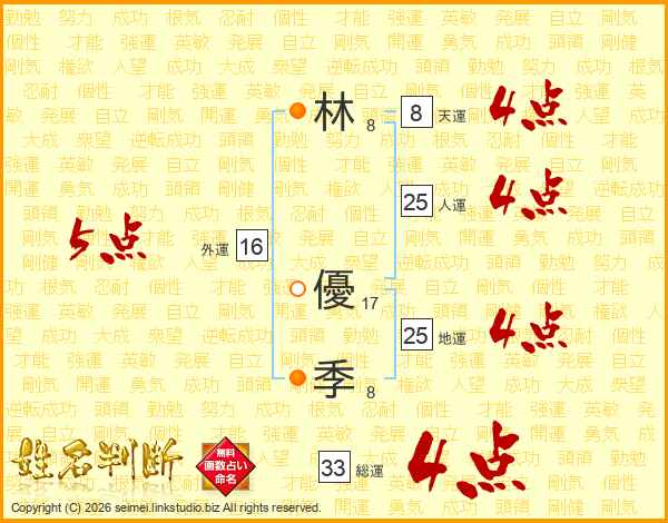 林(8画) 優(17画)季(8画)