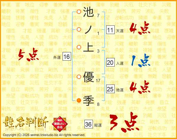 池ノ上優季さんの地運は25画の4点!