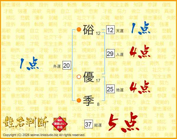 生活面を象徴する運勢です。外部から受ける影響力を表し、結婚運、家庭運や職場、環境への順応性を表します。総運から人運を引いた画数。姓や名が1文字の場合を除く。