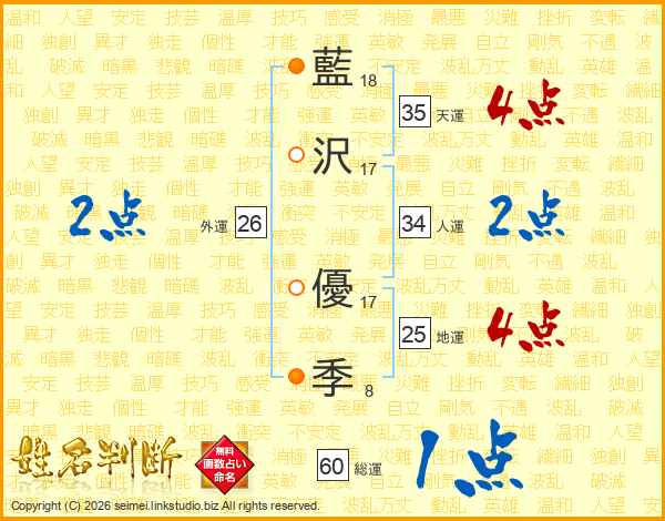 藍(18画)沢(17画) 優(17画)季(8画)