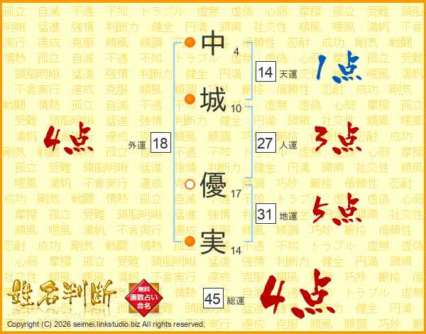 中(4画)城(10画) 優(17画)実(14画)