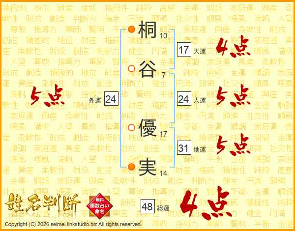 桐(10画)谷(7画) 優(17画)実(14画)
