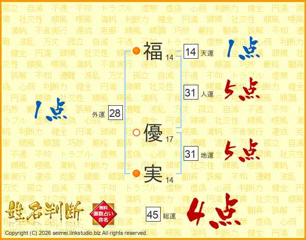 生活面を象徴する運勢です。外部から受ける影響力を表し、結婚運、家庭運や職場、環境への順応性を表します。総運から人運を引いた画数。姓や名が1文字の場合を除く。