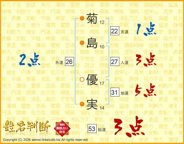 菊(12画)島(10画) 優(17画)実(14画)