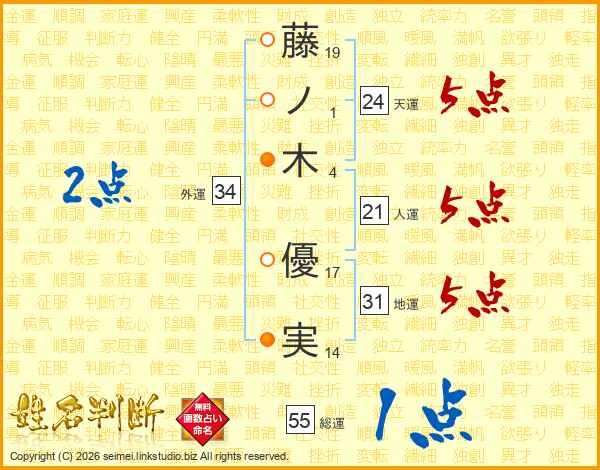 藤(19画)ノ(1画)木(4画) 優(17画)実(14画)