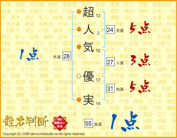 超(12画)人(2画)気(10画) 優(17画)実(14画)