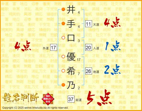 井(4画)手(4画)口(3画) 優(17画)希(7画)乃(2画)