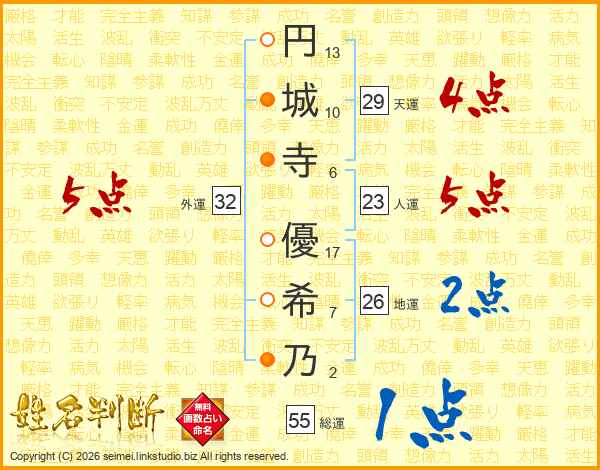 円(13画)城(10画)寺(6画) 優(17画)希(7画)乃(2画)