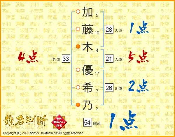 加(5画)藤(19画)木(4画) 優(17画)希(7画)乃(2画)