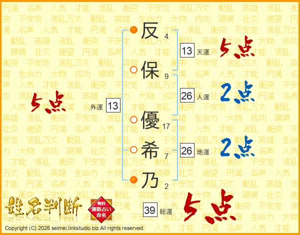 反保優希乃さんの総運は39画の5点!