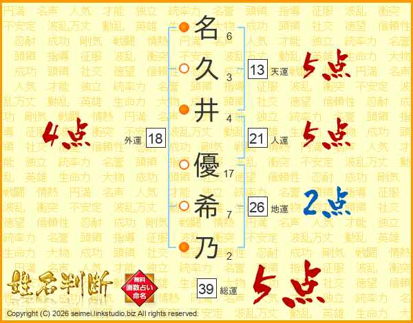 名(6画)久(3画)井(4画) 優(17画)希(7画)乃(2画)