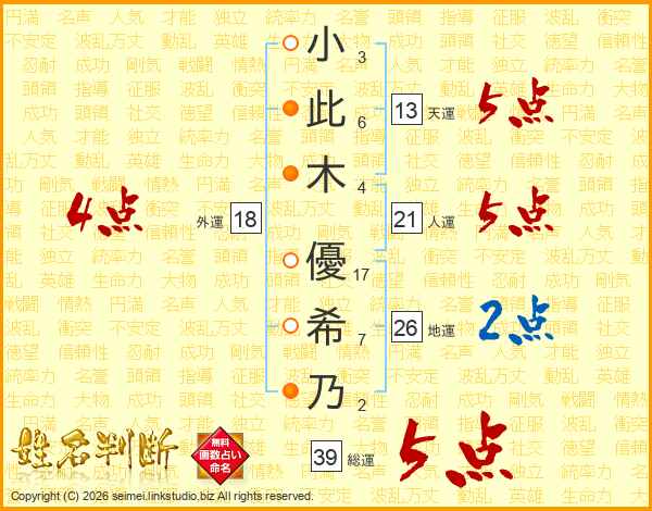 小(3画)此(6画)木(4画) 優(17画)希(7画)乃(2画)