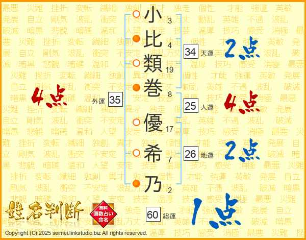 小(3画)比(4画)類(19画)巻(8画) 優(17画)希(7画)乃(2画)