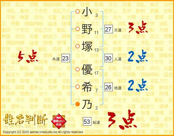 小(3画)野(11画)塚(13画) 優(17画)希(7画)乃(2画)