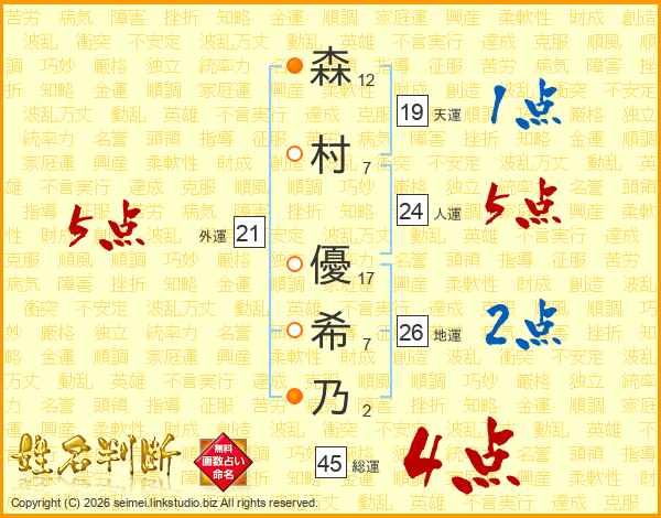 森村優希乃さんの総運は45画の4点!