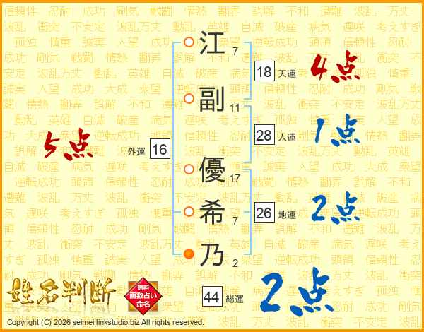 江(7画)副(11画) 優(17画)希(7画)乃(2画)