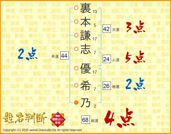 裏(13画)本(5画)謙(17画)志(7画) 優(17画)希(7画)乃(2画)
