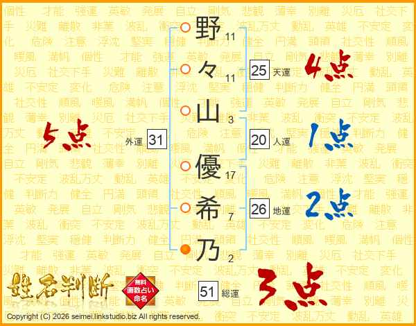 野(11画)々(11画)山(3画) 優(17画)希(7画)乃(2画)