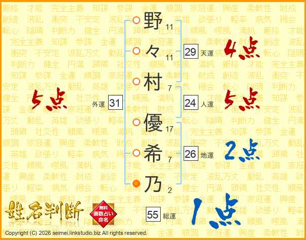 野(11画)々(11画)村(7画) 優(17画)希(7画)乃(2画)