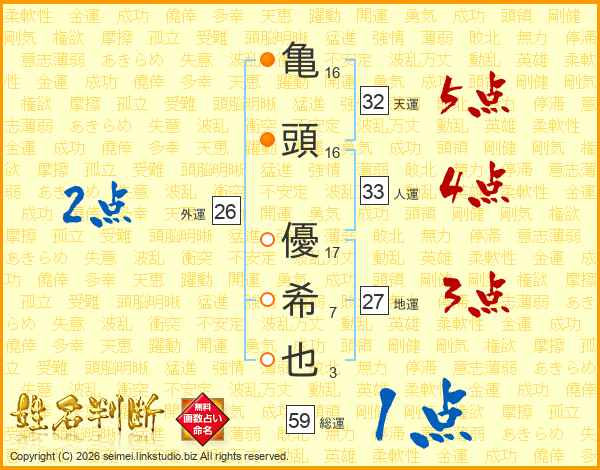 亀(16画)頭(16画) 優(17画)希(7画)也(3画)