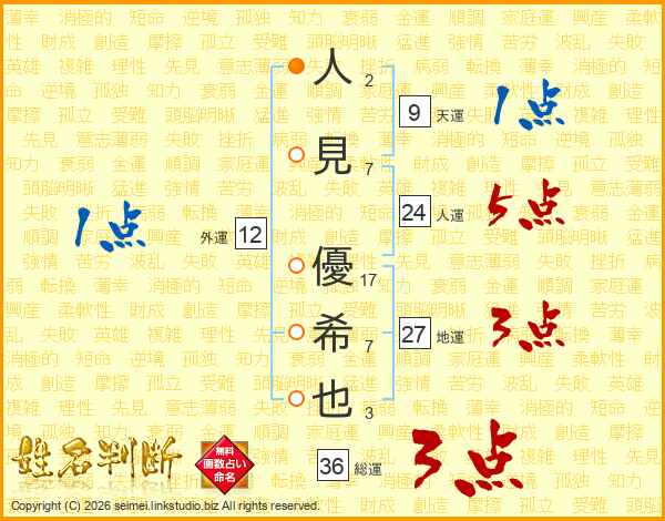 人(2画)見(7画) 優(17画)希(7画)也(3画)