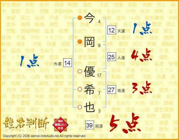 今(4画)岡(8画) 優(17画)希(7画)也(3画)