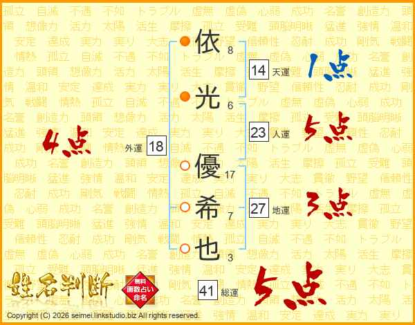 依(8画)光(6画) 優(17画)希(7画)也(3画)