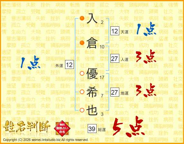 入(2画)倉(10画) 優(17画)希(7画)也(3画)