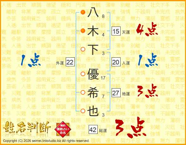 八木下優希也さんの総運は42画の3点!
