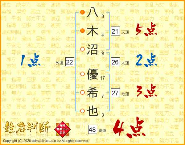 八木沼優希也さんの総運は48画の4点!
