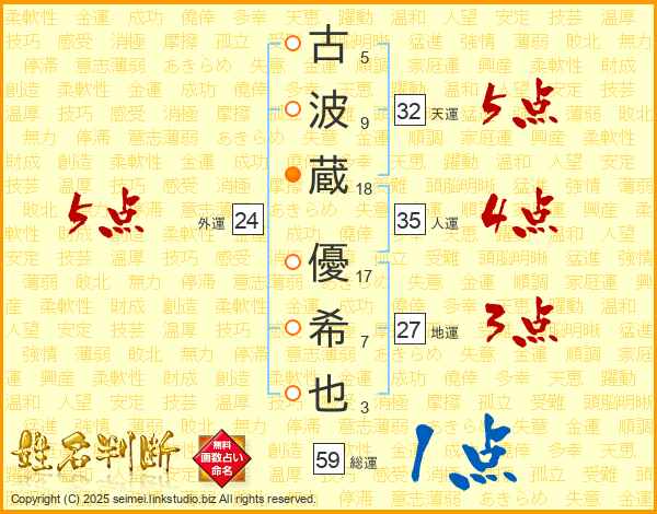 古波蔵優希也さんの総運は59画の1点!