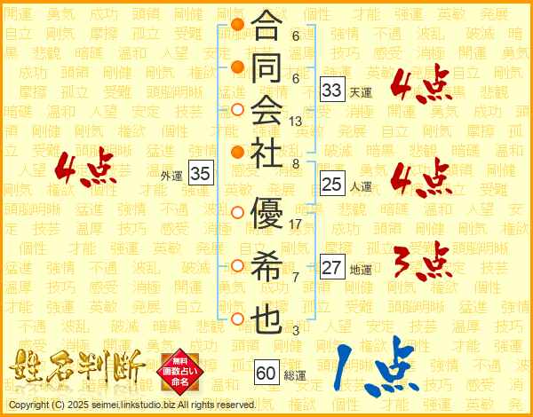 合(6画)同(6画)会(13画)社(8画) 優(17画)希(7画)也(3画)