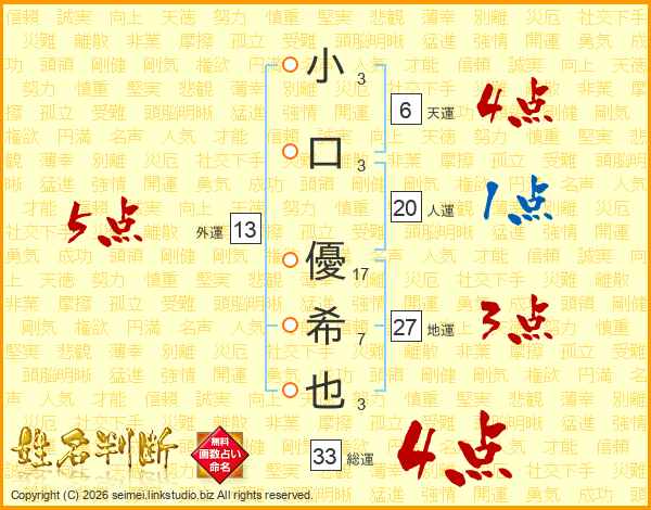 小(3画)口(3画) 優(17画)希(7画)也(3画)