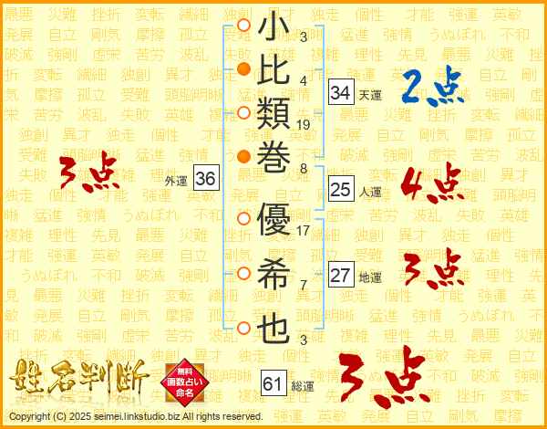 小(3画)比(4画)類(19画)巻(8画) 優(17画)希(7画)也(3画)