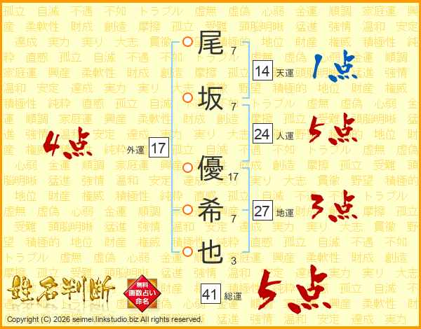尾(7画)坂(7画) 優(17画)希(7画)也(3画)