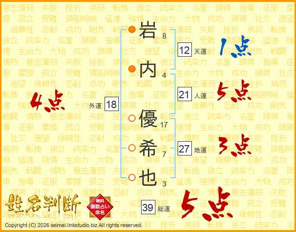 岩(8画)内(4画) 優(17画)希(7画)也(3画)