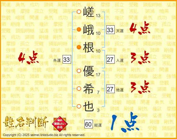 嵯峨根優希也さんの外運は33画の4点!