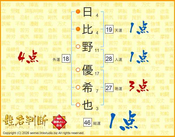 日(4画)比(4画)野(11画) 優(17画)希(7画)也(3画)