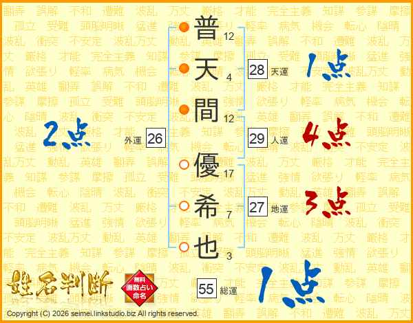 普(12画)天(4画)間(12画) 優(17画)希(7画)也(3画)