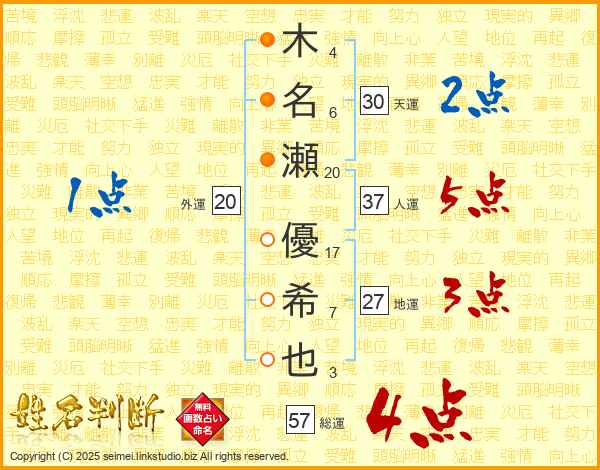 木(4画)名(6画)瀬(20画) 優(17画)希(7画)也(3画)