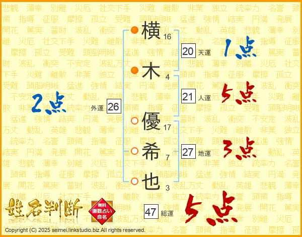 横(16画)木(4画) 優(17画)希(7画)也(3画)