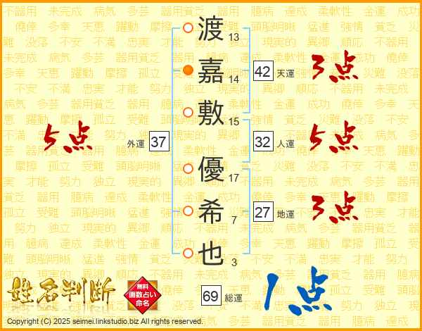 渡嘉敷優希也さんの総運は69画の1点!