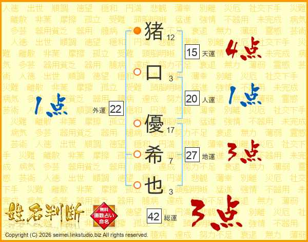 猪(12画)口(3画) 優(17画)希(7画)也(3画)