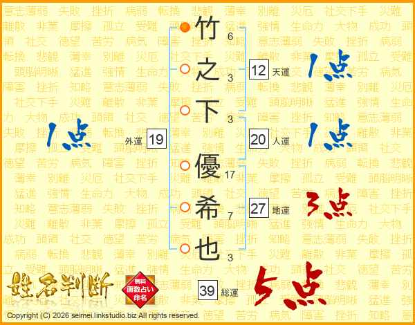 竹之下優希也さんの総運は39画の5点!