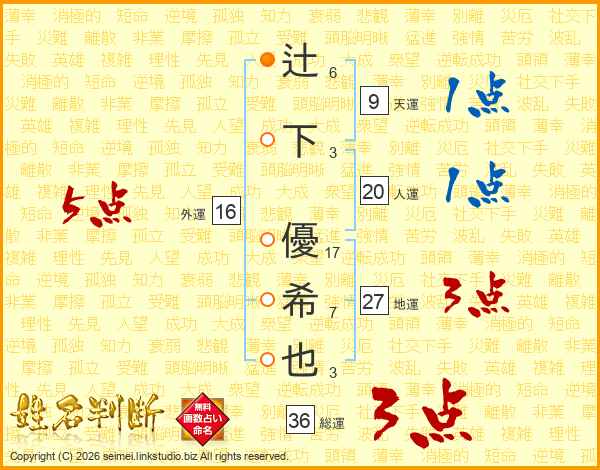 辻下優希也さんの外運は16画の5点!