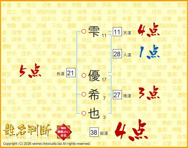 生活面を象徴する運勢です。外部から受ける影響力を表し、結婚運、家庭運や職場、環境への順応性を表します。総運から人運を引いた画数。姓や名が1文字の場合を除く。