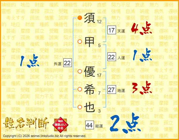 須(12画)甲(5画) 優(17画)希(7画)也(3画)