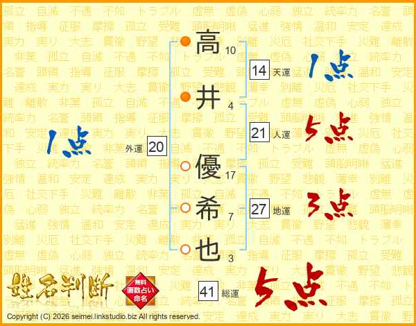 高井優希也さんの総運は41画の5点!