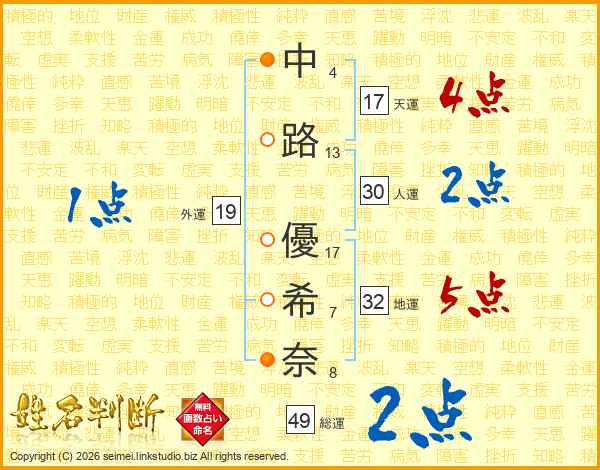 中(4画)路(13画) 優(17画)希(7画)奈(8画)